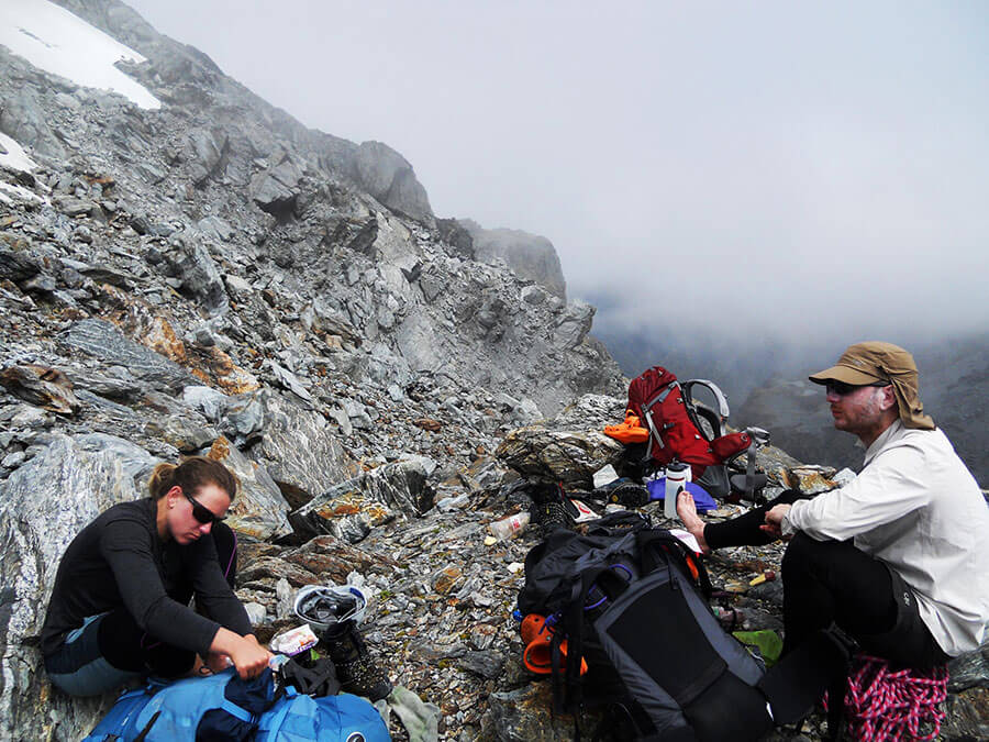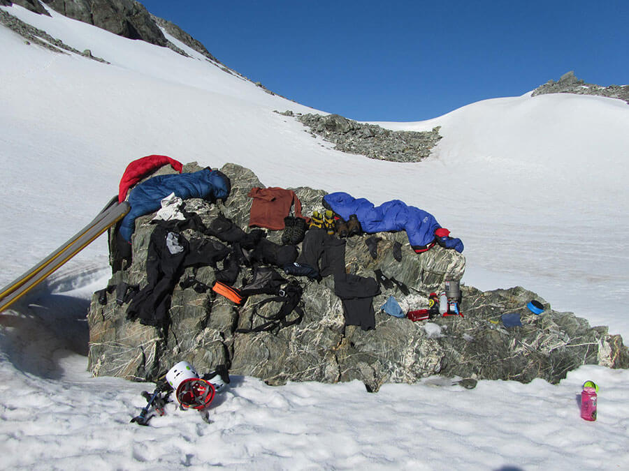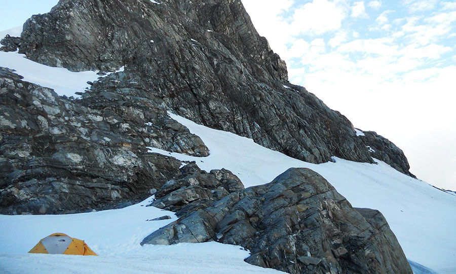 Again we were struck by bad weather. The storm battered our tent from midnight and continued to rain/snow into the next day until around 6.30pm. Adams Col was thankfully sheltered but we still had to dig deep and use our walking poles and axes to anchor the tent in place as the winds were so strong. Unfortunately, one of the poles didn’t make it!