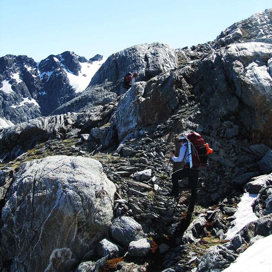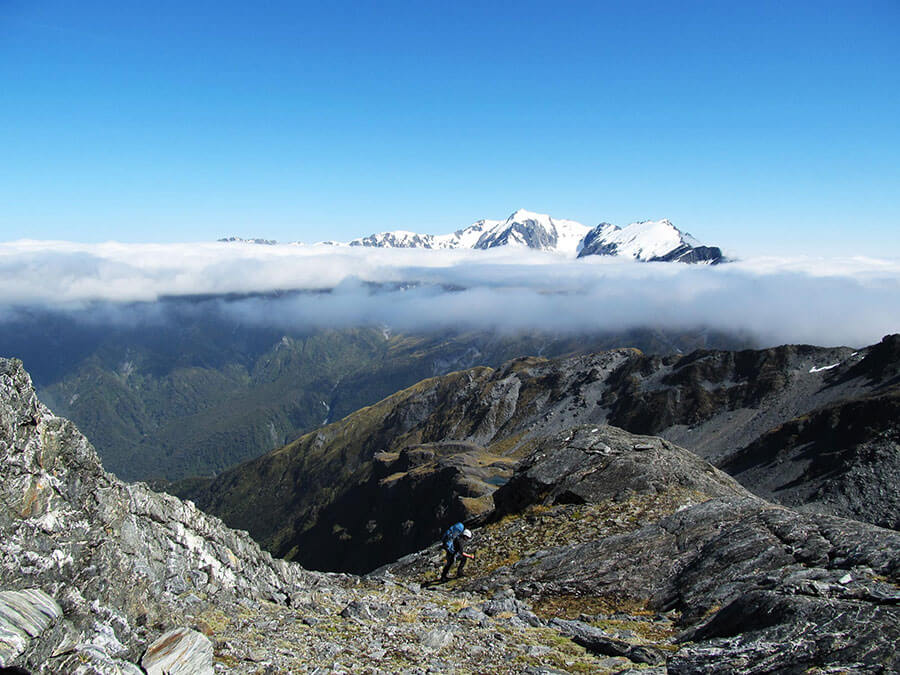 We hit the saddle and climbed up the snow bank in between points 1809m and 1936m to see the Lambert Tops beneath us and signs of West Coast bush in the distance.