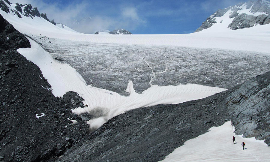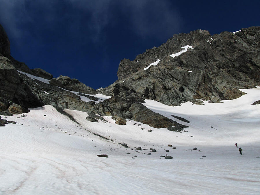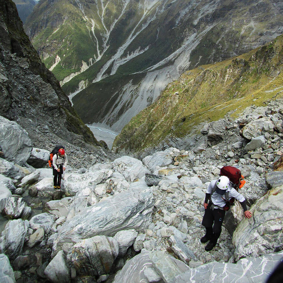 Thankfully, we made it across unscathed, and then quickly climbed up the river valley containing huge boulders towards the saddle. The boulders were huge and could come crashing down at any moment. At one stage, I placed my foot on a steady rock, but knocked a car sized boulder back in the direction of Dave below, only narrowly missing him! Thankfully, we were in single line and traveling far apart for that very reason. Phew!