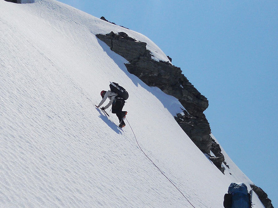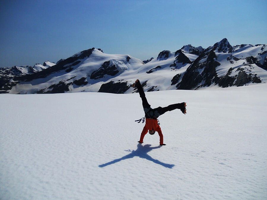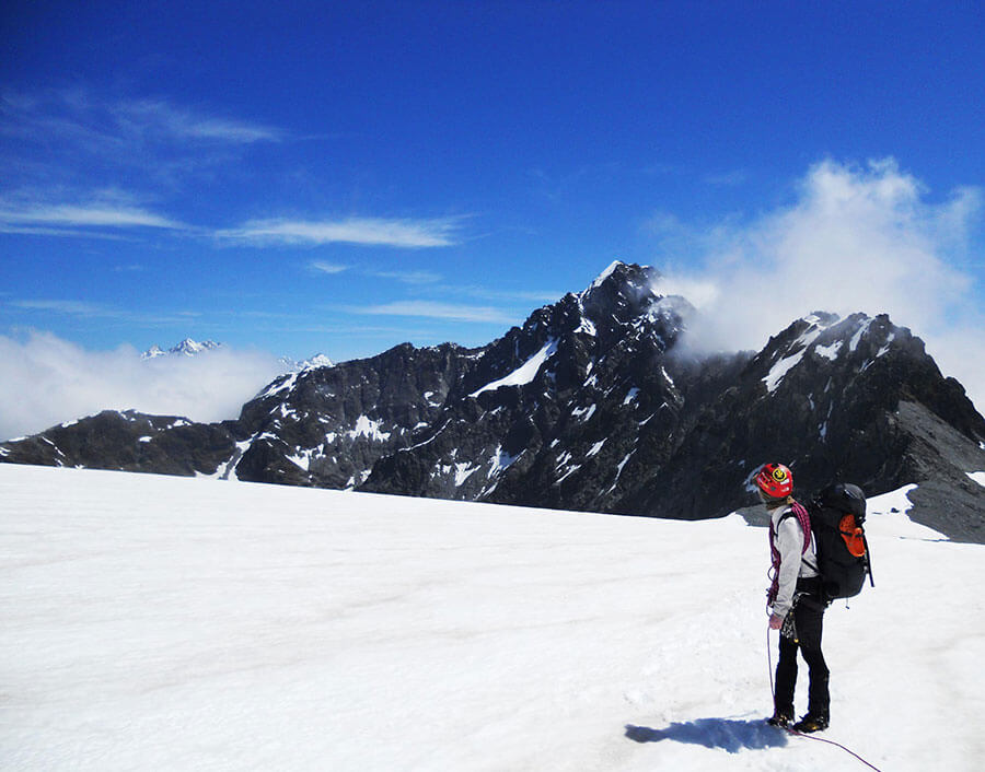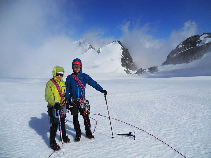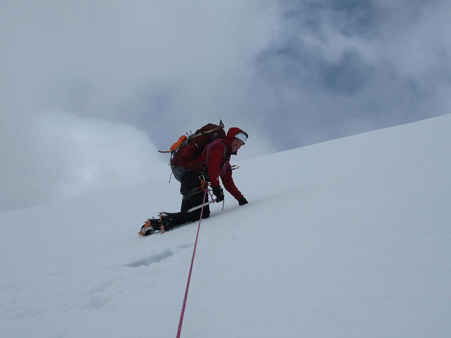 As it wasn’t clear what state the ice was in, we decided to put crampons on at 1900m, stepping onto the Adverse Glacier for the final ascent to the Great Unknown. We roped up on traverse and as if by sheer luck, I immediately fell in a crevasse after taking less than five steps. After scrambling out of my first ice hole of the week, we pushed on to the top and reached what we assumed to be the summit at 4pm (we could see nothing)!