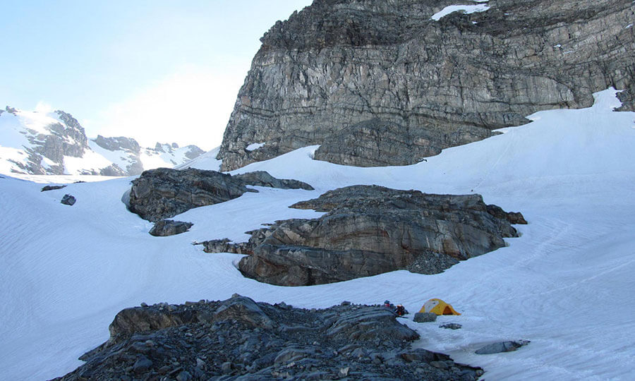 As soon as we put up the tent at 7pm, and as if like clockwork, the cloud retreated and our incredible camp location was revealed. We were all awestruck well into the evening, such an incredible place to eat our final meal on the ice.