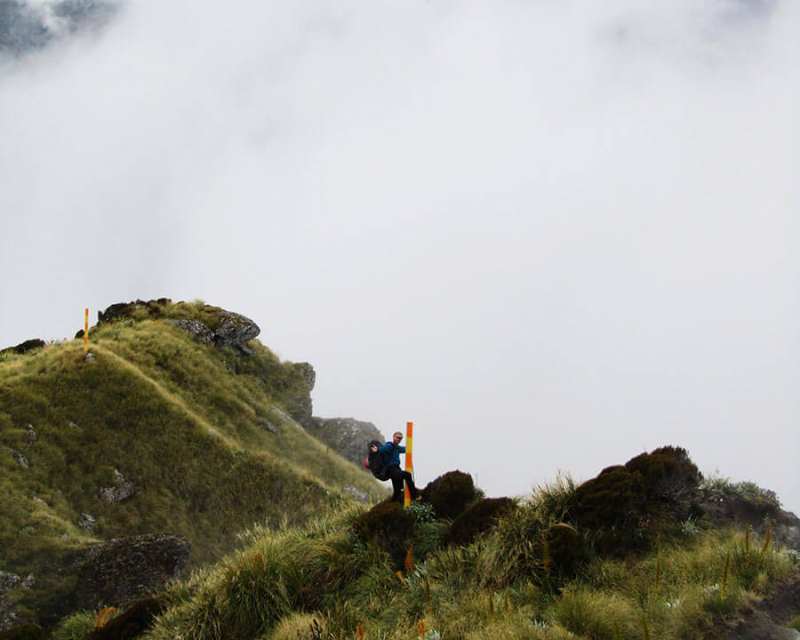 After an hour or so of traversing we caught a glimpse of the first signs of civilisation for days, a huge pole sticking out of the ridge. Dave ran over to the pole and gave it a little hug as we knew we were on our final descent. Unfortunately, Nikki dropped her camera in the long grass and we took a breather to look for it. After about 20 minutes of peering into never ending tussocks, I caught a glimpse of something shiny, it was a lost water bottle and Nikki’s camera.