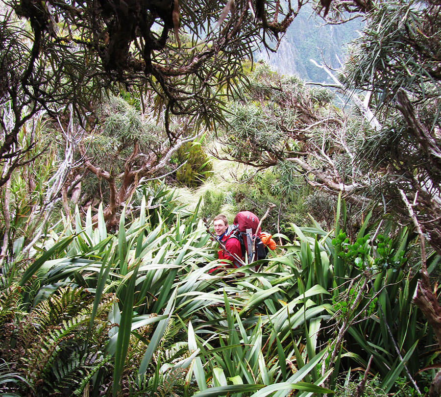 The river itself was beautiful and easy to access, however as gorges and waterfalls appeared above us, we decided to take a route to the east directly up the slope, as to take in a route under the large waterfall. Taking handfuls of scrub and grabbing to vegetation we advanced up through vertical bush for two and a half hours before hitting the top waterfall. Dave had issues near the top where he had a fight with a flax bush that speared him through his shirt, but was alive to tell the tale.