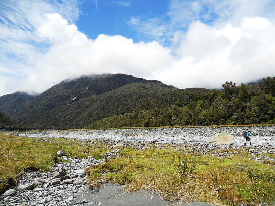 We caught a ride with a family relative of sorts and got dropped off at 8.30am at the Whataroa Tourist Recreation Center, the local helipad where they fly the scenic glacier tours from. So there we were, ready to start, surrounded by steep sided mountains and running water. As usual, I’d forgotten something. This time it was to put my gaiters on, so quickly removed everything from my 25kg pack and embraced the lower leg covering having totally forgotten about the hook grass and how sticks to your legs like superglue.