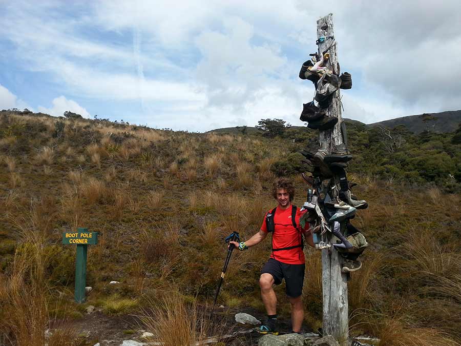 The section to Gouland Downs Hut was flat and downhill – AT LAST! Ticking over the 50km mark felt amazing and we had broken the back of it – we even managed to find time to take photos of the ‘Boot Tree’ – a great mental break in the middle of the sunshine.